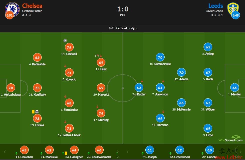 切尔西vs利兹联赛后评分:福法纳破门 7.8分最高