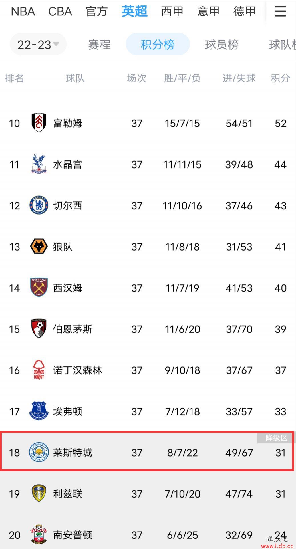 莱斯特城曾在15/16赛季上演奇迹夺得英超冠军。然而目前,莱斯特城8胜7平22负积31分排名第18,深陷降级区。如果想要保级成功,莱斯特必须在最后一轮取胜西汉姆。