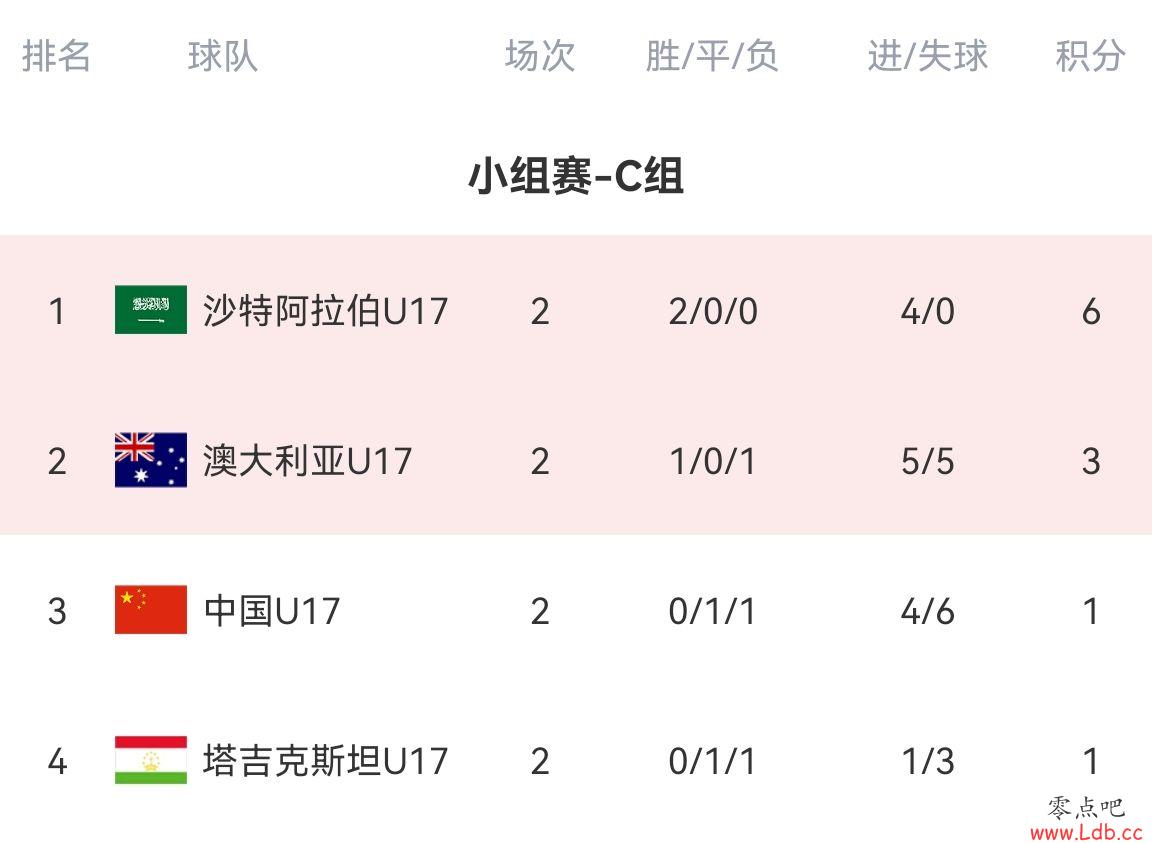 C组第1轮,国少1-1战平塔吉克斯坦,澳大利亚0-2不敌沙特。第2轮国少3-5负于澳大利亚,沙特2-0战胜塔吉克斯坦。