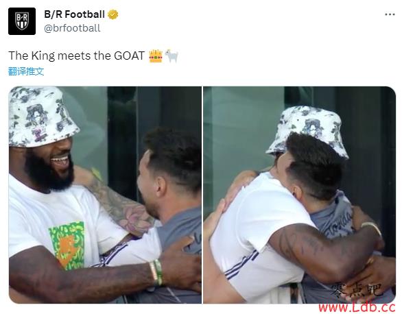 美国媒体B/R Football在社交媒体上晒出詹姆斯拥抱梅西的照片,并写道:“国王见到山羊。”