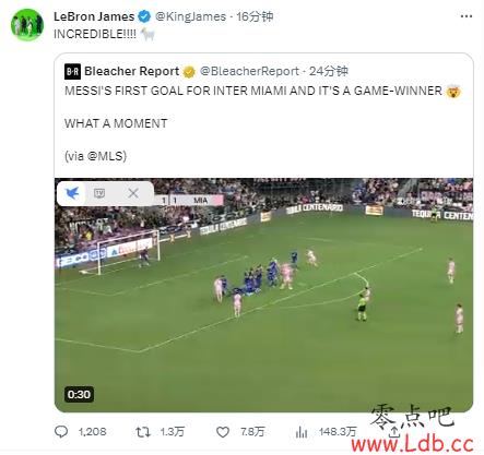 现场观战的詹姆斯转发了这个进球的视频,并写道:难以置信!!!??