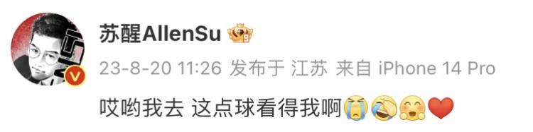 由于点球大战一直踢到了第11轮才见分晓,最终还是靠着双方门将的点球对决才决出胜负,因此苏醒赛后在社媒感叹写道:“哎哟我去!这点球看得我啊!”