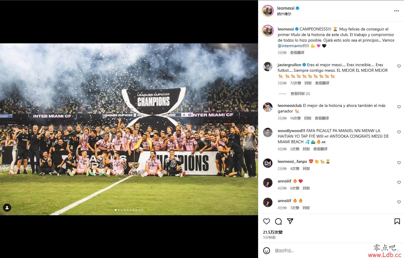梅西更新ins写道:冠军!!!非常高兴能获得队史的首个冠军,所有人的努力让这一切成为了可能。希望这只是开始,加油@迈阿密!
