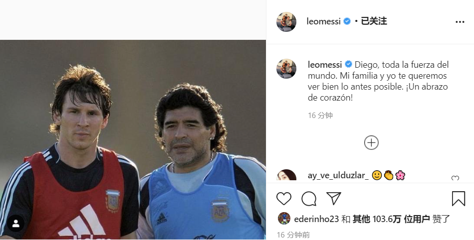 “迭戈,全世界都会给予你力量。我和我的家人都希望你早日康复。给你一个发自内心的拥抱!”