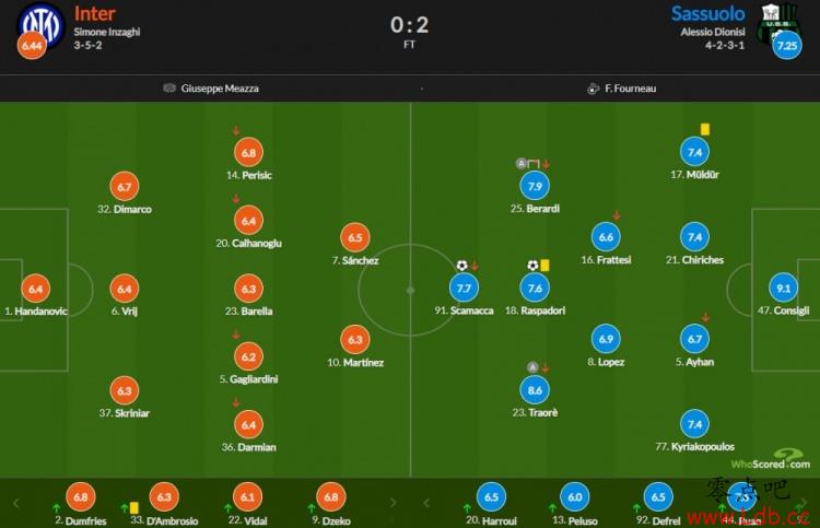萨索洛:孔西利 9.1 米尔杜尔 7.4 基里凯什 7.4 艾汗 6.7 基里亚科普洛斯 7.4 弗拉泰西 6.6 马克西姆-洛佩斯 6.9 贝拉尔迪 7.9 拉斯帕多里 7.6 H-特劳雷 8.6 斯卡马卡 7.7